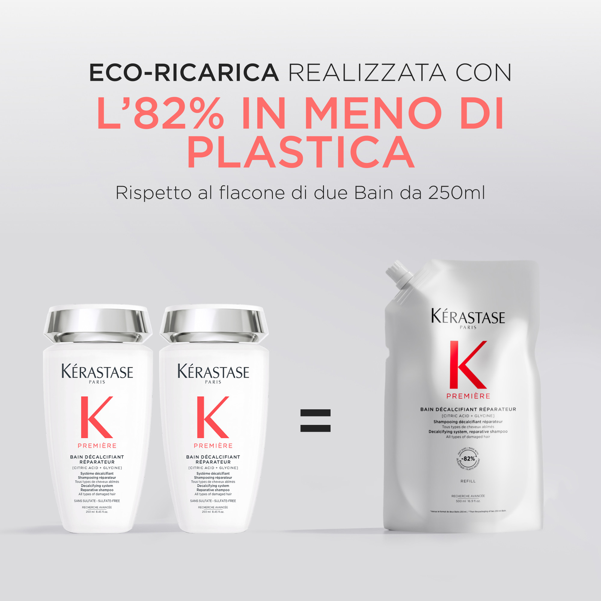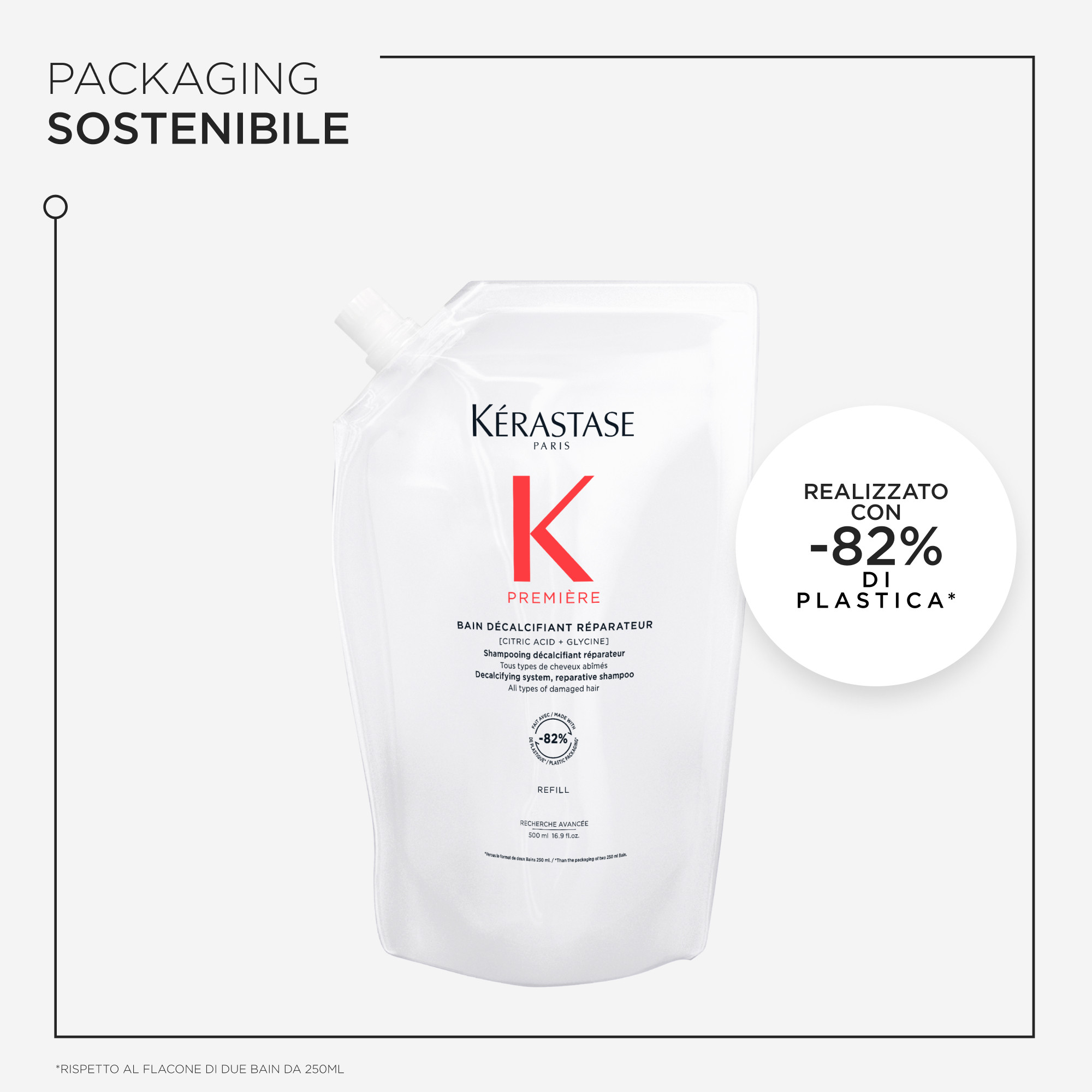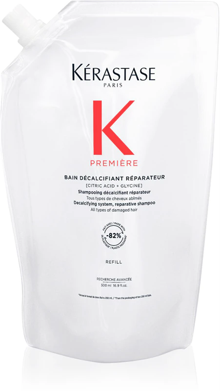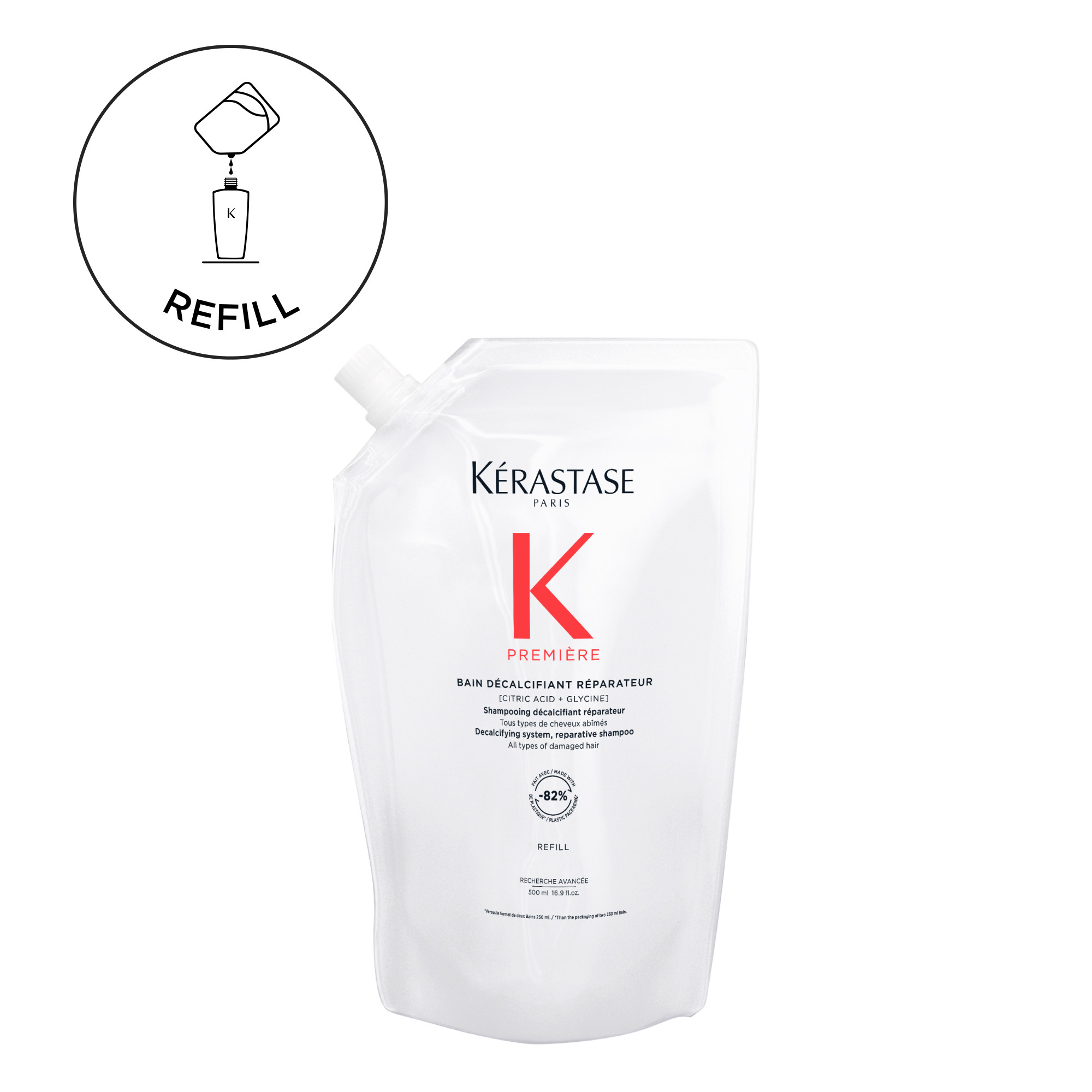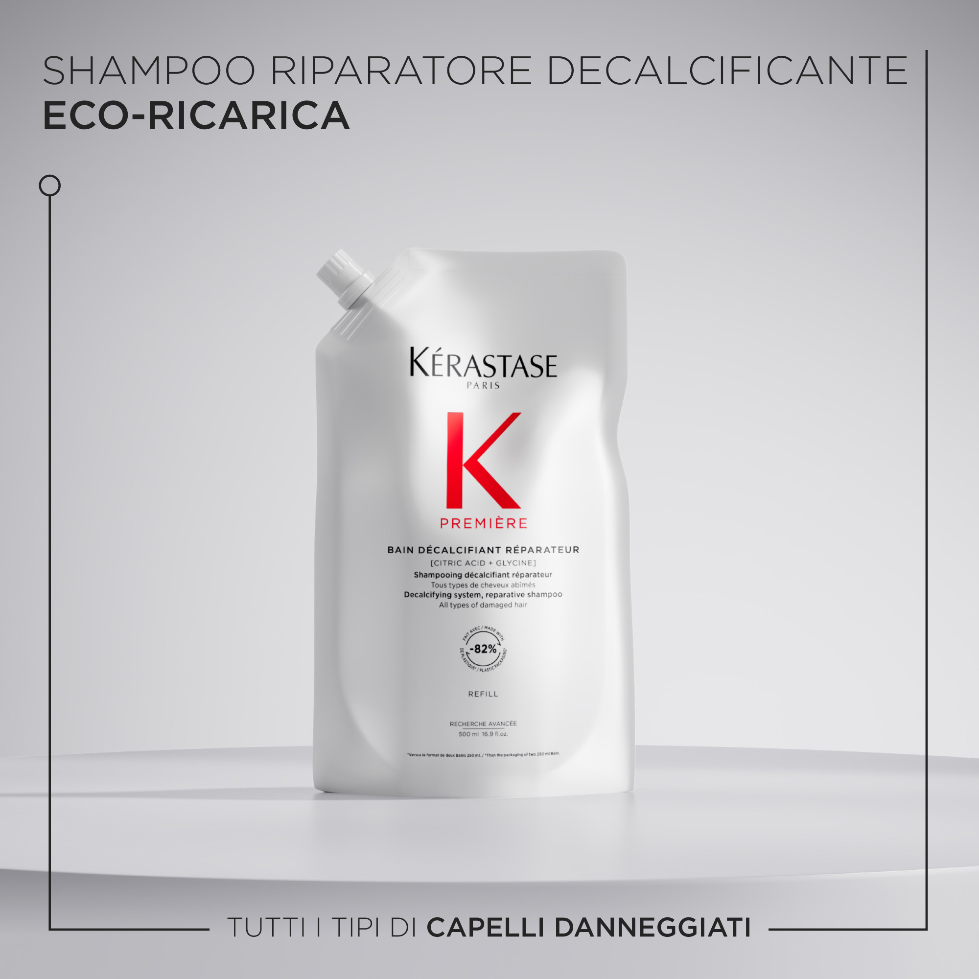 Shampoo riparatore decalcificante* per capelli danneggiati. Uno shampoo doppia azione che ripara la fibra dall’interno, rimuovendo il calcio in eccesso e rafforzando il capello danneggiato. *Test strumentale dopo 6 applicazioni di Première Concentré + Bain + Fondant/Mascherav