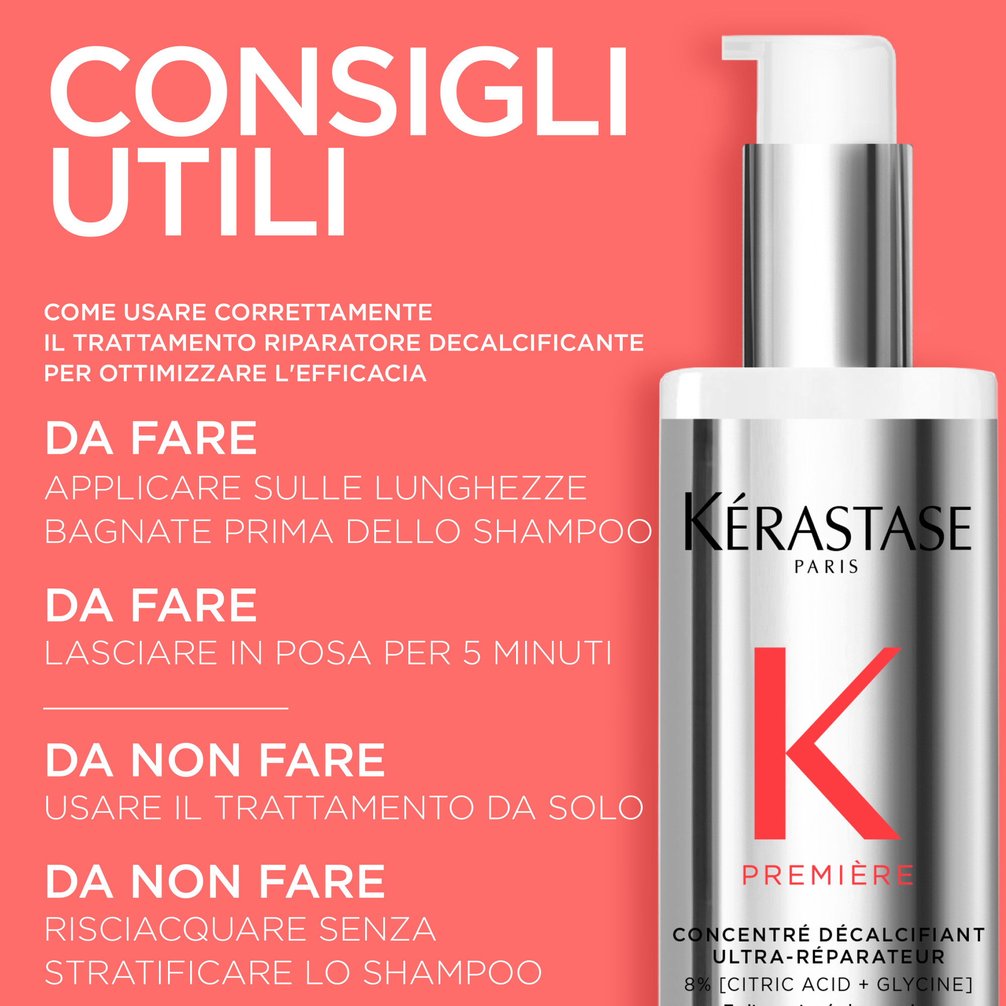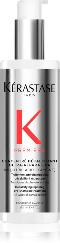 Trattamento pre-shampoo doppia azione decalcificante e riparatore per capelli danneggiati. Rimuove il calcio e migliora la forza dei capelli, rendendoli più morbidi e più luminosi.