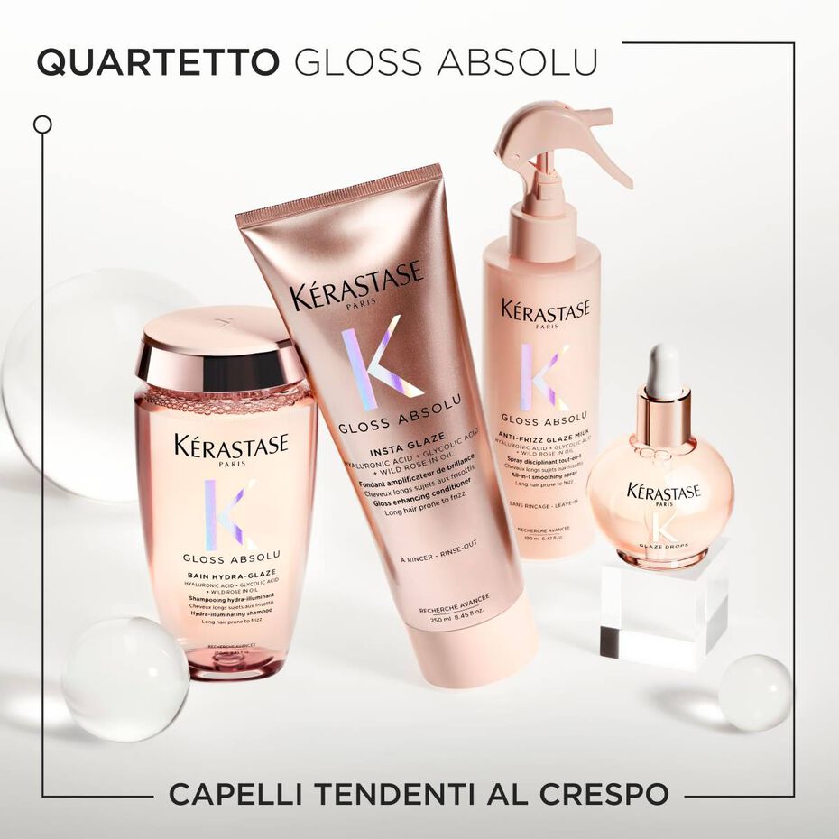 Rituale Brillantezza Anti Crespo Gloss Absolu, composto dallo shampoo Bain Hydra-Glaze, dal balsamo Fondant Instant Glaze e dall’olio Huile Glaze Drops, per capelli sani e lucenti.