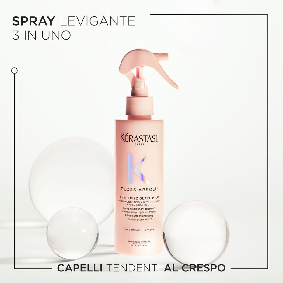 Anti-Frizz Glaze Milk di Kérastase è uno spray levigante tutto-in-uno per capelli lunghi tendenti al crespo.